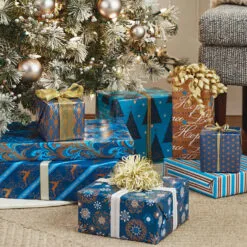 Hallmark Elegant Blues 4-Pack Blue And Gold Reversible Wrapping Paper, 150 Sq. Ft.