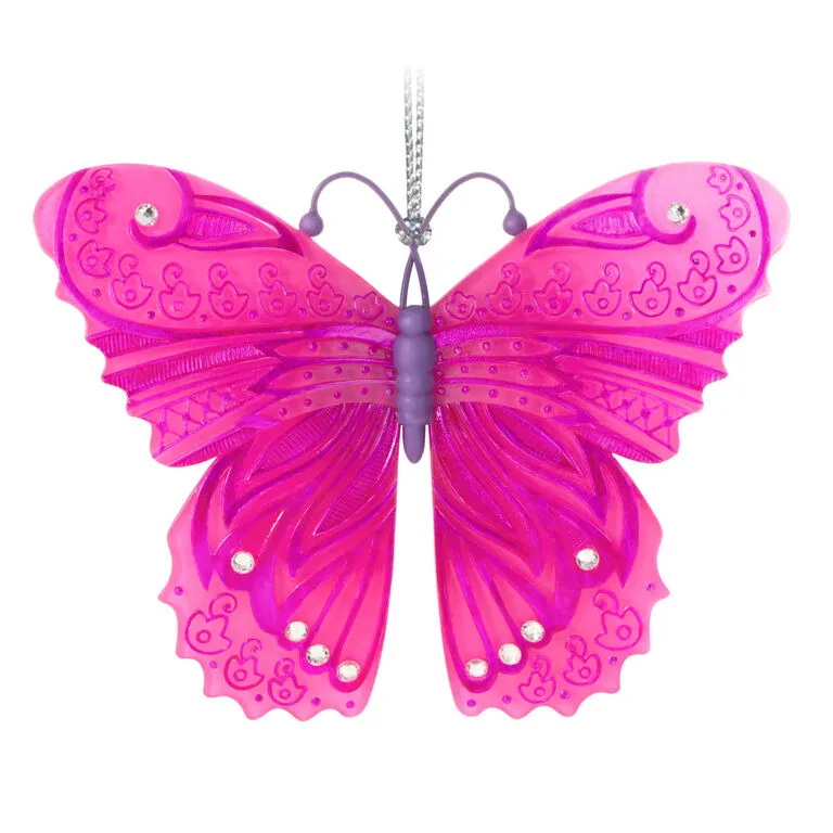 Send spirits soaring with this pretty butterfly Christmas tree ornament. The graceful pink and purple butterfly features a beautiful floral design with gem accents. Softly scalloped edges and a subtle iridescent finish on the wings are sure to delight all who see it.