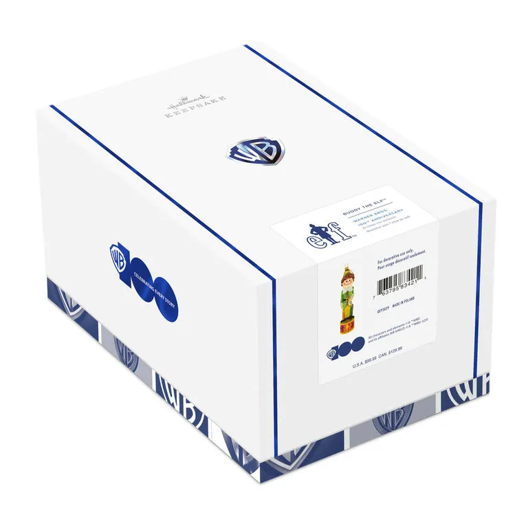 Celebrate 100 years of storytelling from the Warner Bros. Studios with this playful, blown glass Christmas tree ornament of Buddy the Elf from the hilarious holiday film “Elf.” If smiling is your favorite thing to do and you think Christmas is the greatest day in the whole wide world, your tree won’t be complete without this stylized design of Santa’s oversized helper holding a bottle of syrup.
