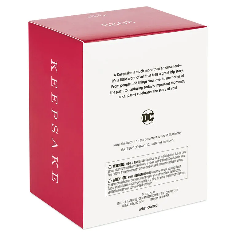 In Space Sector 2814 and elsewhere throughout the known universe, intergalactic peacekeepers of the Green Lantern Corps keep their power rings charged by using their distinctive lantern-shaped power batteries. Now Green Lantern’s light can brighten your holiday through this Christmas tree ornament that illuminates at the push of a button (battery-operated).