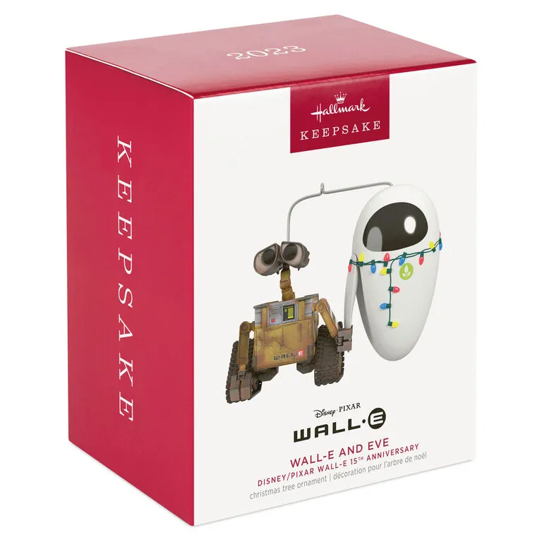 Celebrate the 15th anniversary of the fantastical journey across the universe in the movie “Wall-E.” This cute Christmas tree ornament features Wall-E and Eve holding hands. Fans of the friendly waste-collector robot and his extraterrestrial sweetheart are sure to love this Disney/Pixar decoration. Insert the bulb of a standard miniature light string through the rubber grommet on Eve’s back to create a special lighting effect.