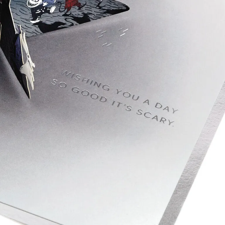 Pop-up greeting card cover features a Pumpkin King flourish design, “Happy Nightmares” message and a shiny silver foil border. Simply open the card to reveal the 3D pop-up surprise inside—no assembly required: an intricate, laser-cut “The Nightmare Before Christmas” scene pops out with Jack Skellington highlighted against a die-cut moon while Zero, Sally, Oogie Boogie and other favorite characters gather around the base. Shimmering silver foil accents adds spooktacular style. This exquisitely detailed card crafted from premium card stock is a work of art sure to be displayed all year long, making it an unforgettable choice for any fan of “The Nightmare Before Christmas” on their birthday, Halloween, Christmas or any other special occasion. When open, this pop-up card lays flat for display; 3D pop-up inside measures approx. 3.5″ H.