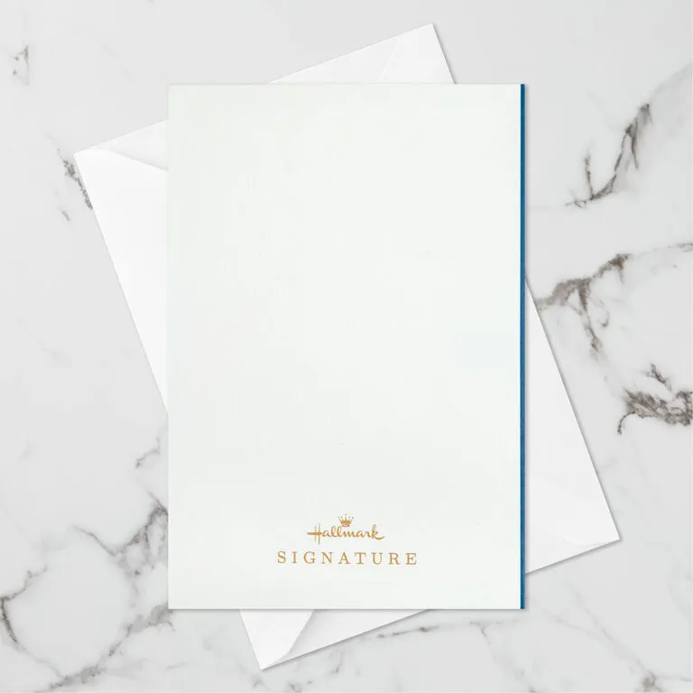 Pop-up Hanukkah greeting card features a menorah with gold foil accents, a gold foil border and a “Happy Hanukkah” message on a navy blue background. Simply open the card to reveal the 3D pop-up surprise inside—no assembly required: an intricate, laser-cut candle-filled menorah surrounded by leaves pops out. Gold foil accents add a shiny touch to the inside of the card. This unique card crafted from premium card stock is a work of art sure to be displayed all season long, making it an unforgettable way to celebrate the Festival of Lights. When open, this pop-up card lays flat for display; 3D pop-up inside measures approx. 3.75″ H.
