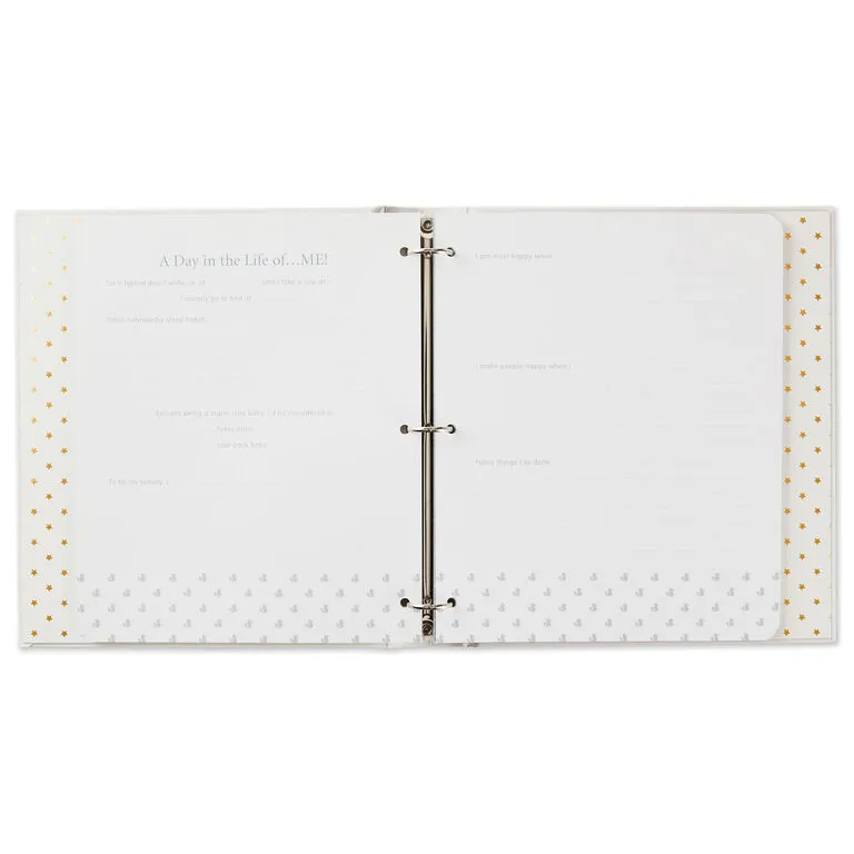 - Hardcover three-ring binder baby book features gold foil lettering and design on cover.