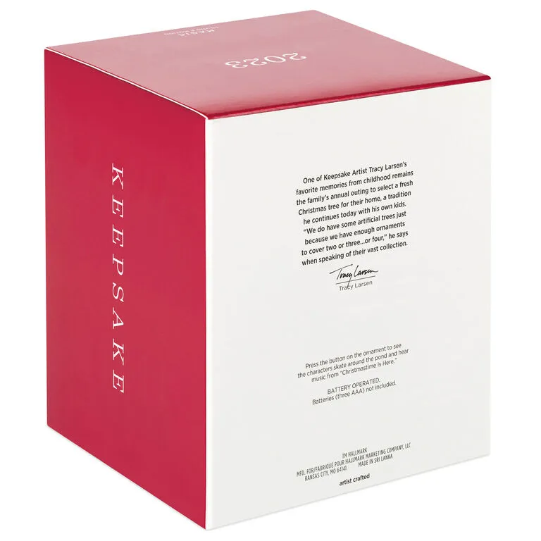 Happiness is spending the holidays with your favorite people! Peanuts pals Charlie Brown, Linus and Snoopy spend a playful day on a frozen pond in this charming Christmas tree ornament. Press the button to see Snoopy and Linus ice skate and hear music from “Christmastime Is Here” (battery-operated).